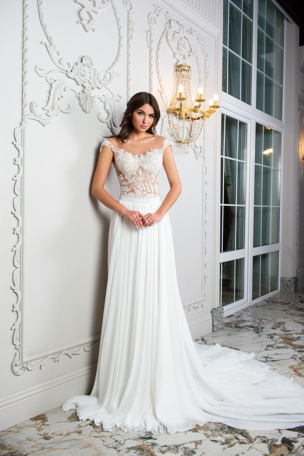Dieses A-Linie Brautkleid mit Spitzenoberteil in Tattoooptik, Chiffonrock, Schleppe und durchsichtiger Korsage in Ivory verkörpert zeitlose Romantik mit modernem Twist. Das Oberteil in edler Tattoooptik begeistert mit floraler Spitze, die sich filigran über die durchsichtige Korsage legt und so den Eindruck einer auf der Haut liegenden Verzierung erzeugt – ein absoluter Hingucker.