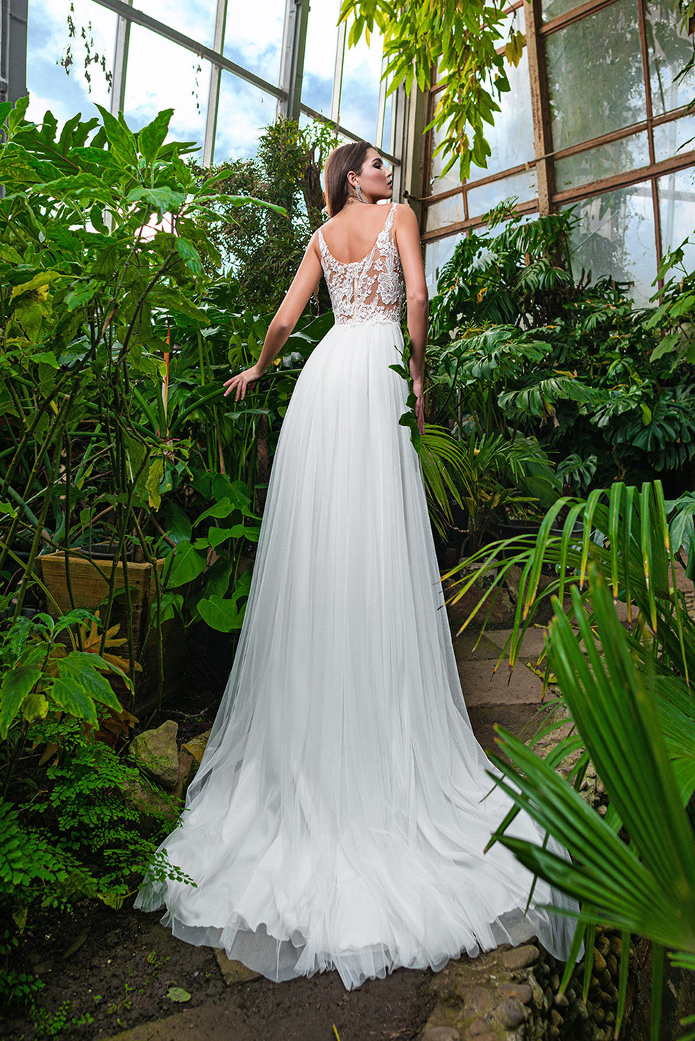Dieses traumhafte A-Linien Brautkleid verzaubert mit Leichtigkeit, Eleganz und floraler Romantik. Ideal für Bräute, die ein feminines und modernes Kleid mit märchenhafter Ausstrahlung suchen. Die Kombination aus zarter Spitze, fließendem Tüllrock und schlichtem Reißverschluss macht dieses Kleid zu einem echten Lieblingsstück für Gartenhochzeiten, Gewächshaus-Trauungen oder elegante Sommerfeste.
