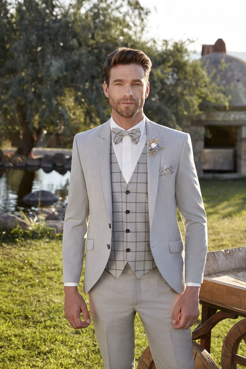 Dieser moderne Hochzeitsanzug in einem hellen Beigeton mit eleganter Karoweste ist die perfekte Wahl für stilbewusste Bräutigame, die Leichtigkeit, Eleganz und Persönlichkeit an ihrem großen Tag kombinieren möchten. Die harmonische Kombination aus klassischem Schnitt, modernen Details und hochwertigem Material macht diesen Anzug zu einem echten Hingucker – besonders für Frühlings- und Sommerhochzeiten im Freien.