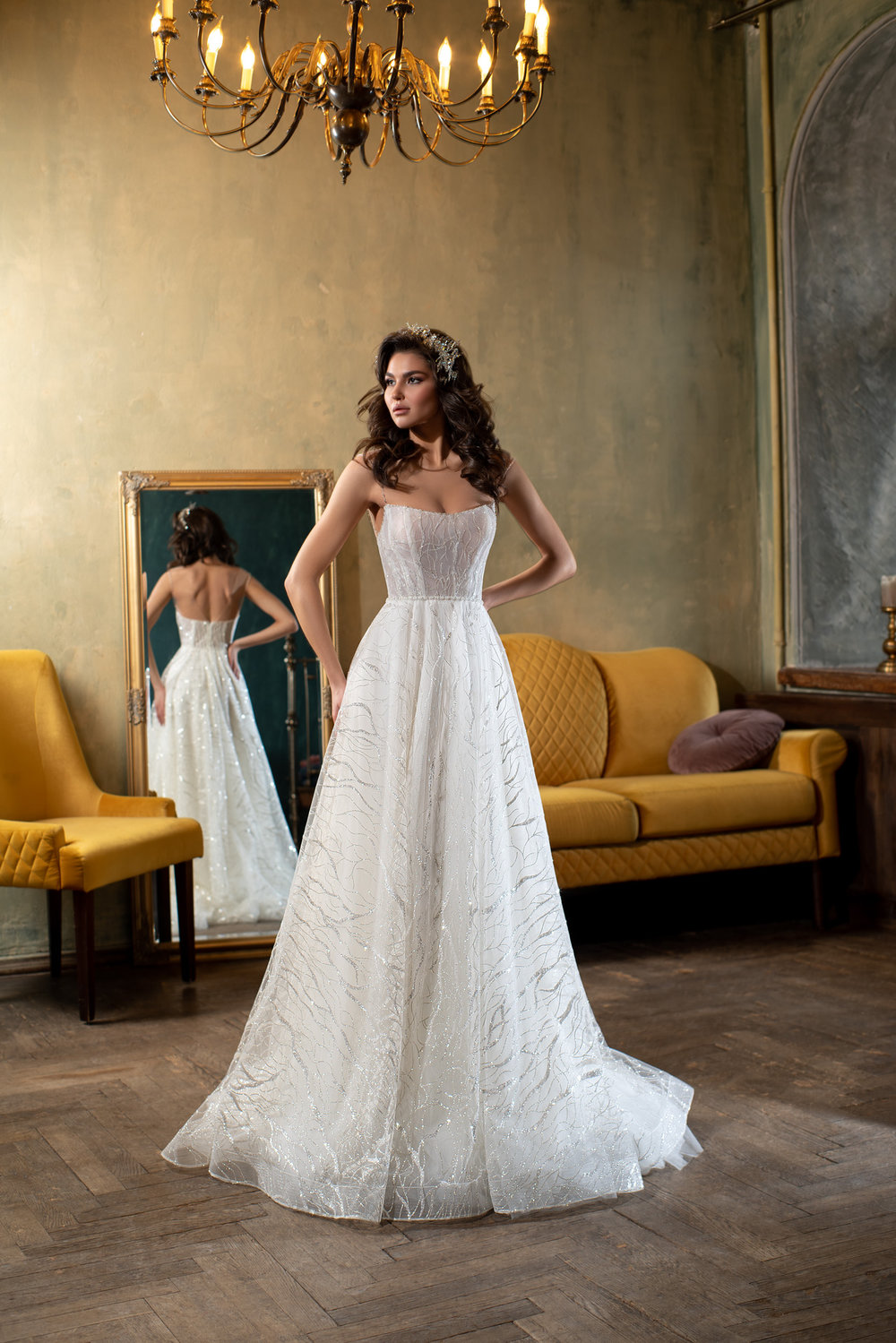 Die Herz-förmige Corsage ist kunstvoll gearbeitet und wird von feinen Stäbchen strukturiert, die nicht nur Halt bieten, sondern auch die Taille optisch verschlanken. Die dezent schimmernde Glitzerstickerei auf dem Oberteil verleiht dem Kleid eine subtile Brillanz, die bei jedem Lichtspiel zur Geltung kommt. Der Trägerlose Schnitt betont Schultern und Dekolleté und lässt sich perfekt mit einem Schleier oder einem funkelnden Haarreif kombinieren.