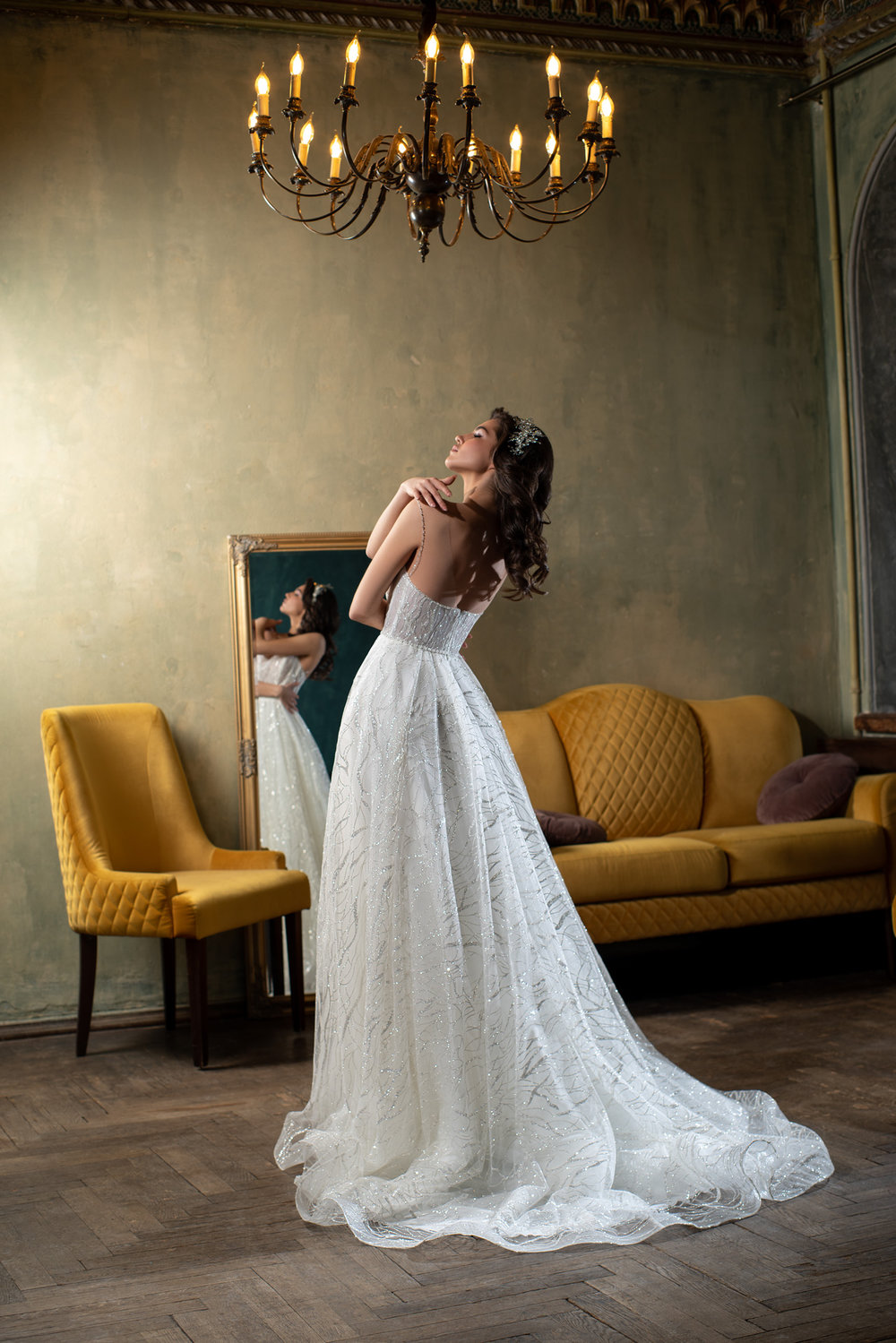 Ein besonderes Highlight ist der verdeckte Reißverschluss am Rücken, der sich harmonisch in die zarte Spitze einfügt. Die Rückenpartie ist elegant gestaltet und sorgt für einen stilvollen Abgang. Der dezente Glitzereffekt im gesamten Kleid verleiht der Braut einen magischen Glow – perfekt für unvergessliche Hochzeitsbilder.