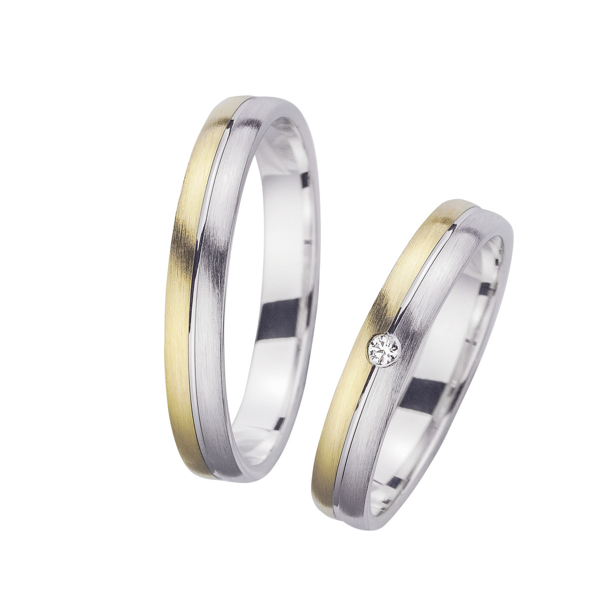 Die Kombination aus kühlem Silberton und warmer goldener Nuance verleiht diesen Trauringen ihre besondere Ausstrahlung. Der zarte Mittelstreifen in Gold setzt einen eleganten Akzent, der nicht nur optisch begeistert, sondern auch symbolisch für die Verbindung zweier Persönlichkeiten steht. Das Damenmodell ist zusätzlich mit einem dezent eingefassten Brillanten veredelt, der für Ewigkeit, Reinheit und Licht steht – perfekt, um eure Liebe für die Zukunft zu besiegeln.