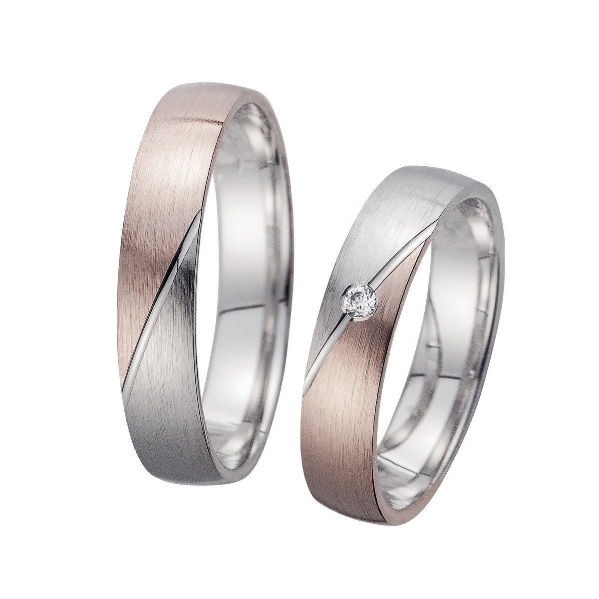 Diese zweifarbigen Trauringe mit schrägem Design und Brillantbesatz stehen für moderne Eleganz und Symbolkraft. Die Kombination aus zwei Edelmetalltönen – warmem Rosé und kühlem Weiß – macht diese Eheringe zu einem echten Blickfang. Die schräg verlaufende Fuge teilt die beiden Farben sanft und verleiht dem Ring eine dynamische, fließende Form.