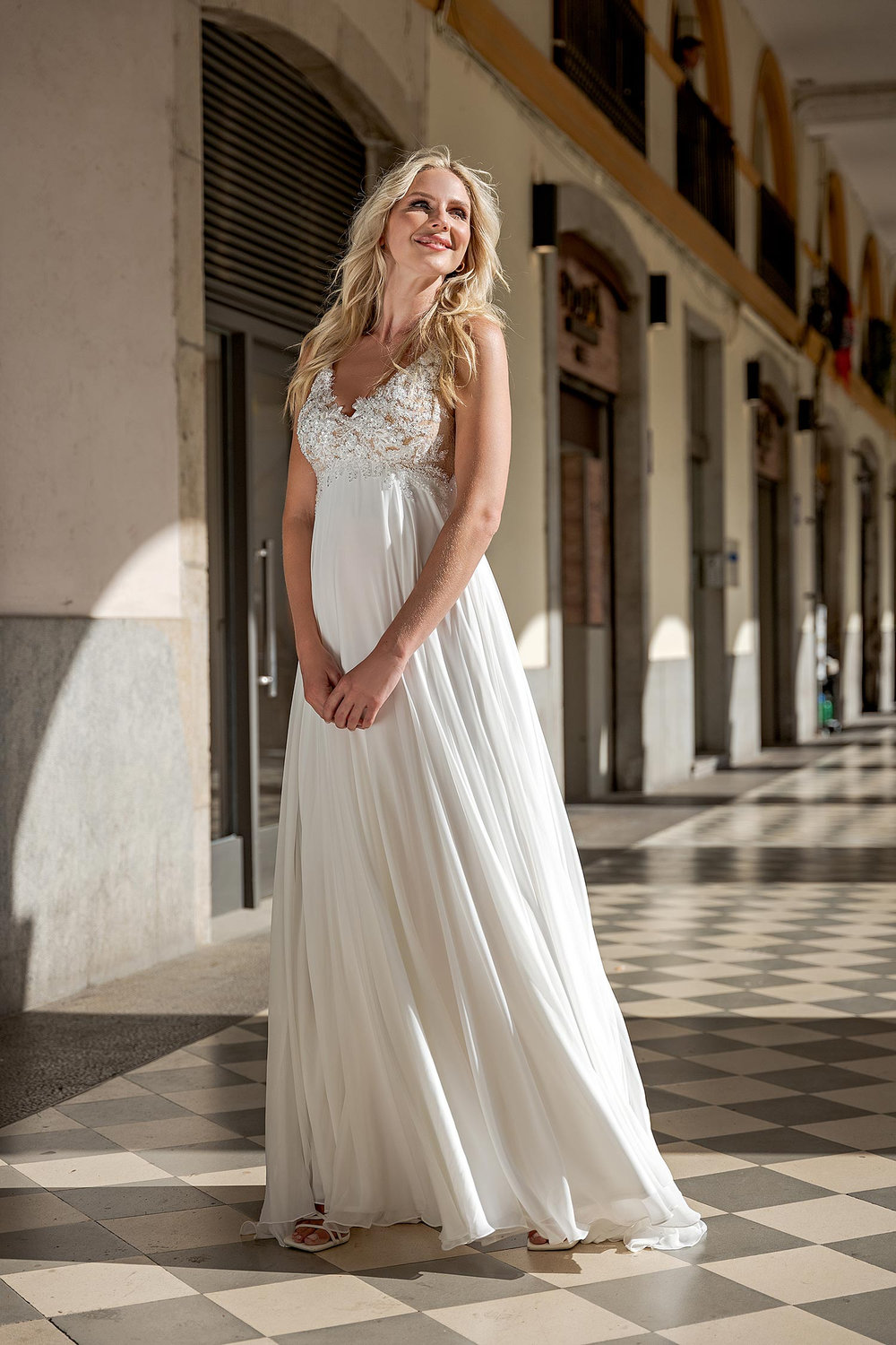 Umstandsbrautkleid mit floraler Spitze und fließendem Rock – ideal für schwangere Bräute