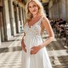 Das fein gearbeitete Spitzenoberteil mit floralen Applikationen verleiht dem Kleid eine romantische Note. Die breiten, bestickten Träger sorgen für einen sicheren Sitz, während das dezent transparente Dekolleté die Silhouette charmant unterstreicht. Der leicht ausgestellte Rock aus fließendem Chiffon fällt sanft über den Bauch und lässt sich dank des elastischen Schnitts angenehm tragen – ganz gleich, in welchem Trimester du dich befindest.